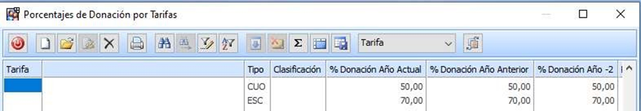 En la tabla de porcentajes de donación por tarifas incorporamos aquellos tipos que la donación NO es del 100% del importe e indicamos el porcentaje. En el ejemplo 50 y 70% para Cuotas y Escuelas.
