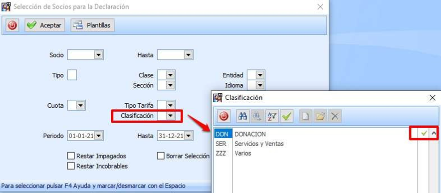 En el momento de calcular las donaciones desde “Selección de socios para la declaración” escogeríamos solo tarifas etiquetadas con el campo clasificación “Donación” del periodo a evaluar (2021 en el ejemplo), como se ve en la imagen: