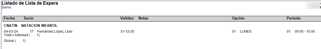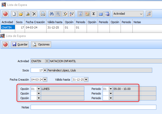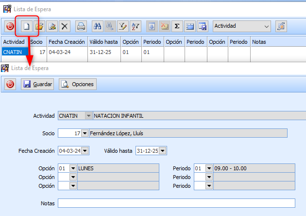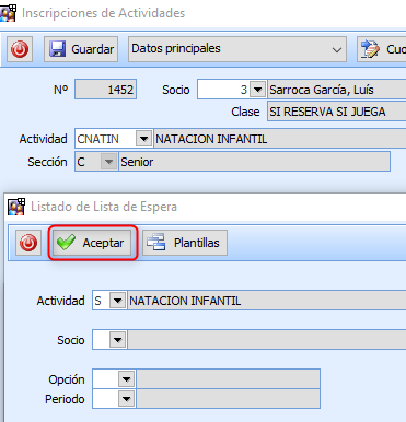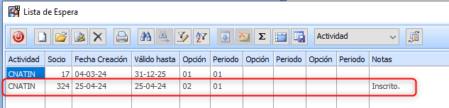 Al grabar una nueva Inscripción, si el Socio estaba en Lista de Espera de la Actividad, se graba en Notas «Inscrito» y como Fecha de Validez la Fecha del día, para que ya no aparezca en el listado de Lista de Espera.