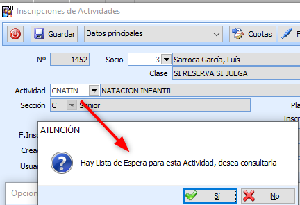 Despues en la Inscripción de la Actividad, estando en un alta de Inscripción, tras indicar la Actividad, si no hay Plazas Disponibles se pregunta si desea acceder a la Lista de Espera para registrar al Socio.