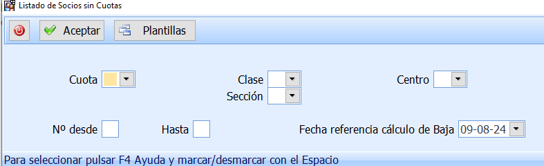 Para imprimir los Socios que no tienen asignada ninguna Cuota, dejar el dato el blanco.