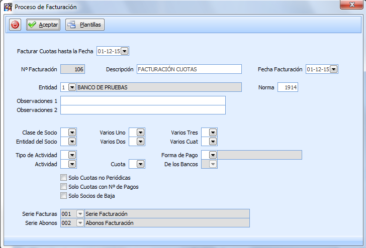 Una vez realizadas las comprobaciones, verificadas y corregidas en caso de ser necesarias las cuotas a facturar, procederemos a facturar las cuotas pendientes convirtiéndolas en Facturas/Recibos, para bien cobrar por Caja o Domiciliación Bancaria