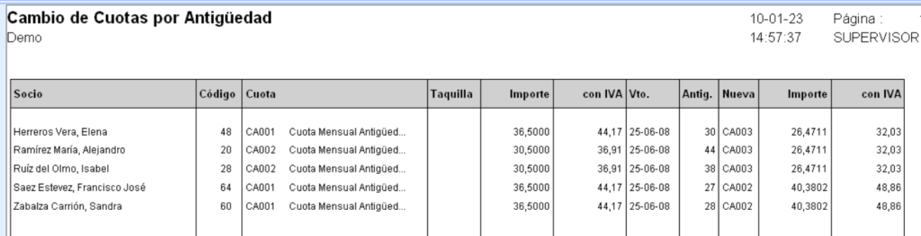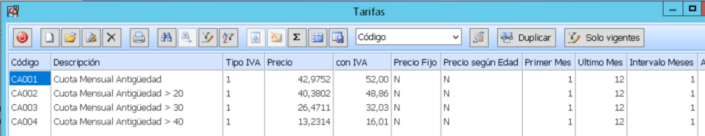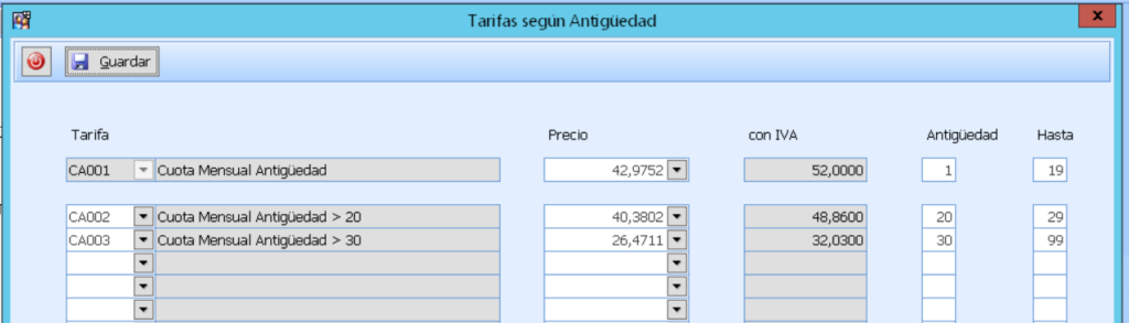 En el ejemplo que os mostramos vemos como un socio con antigüedad de 19 tienen una cuota específica y mantienen su precio fijo.