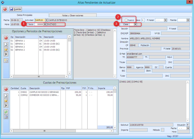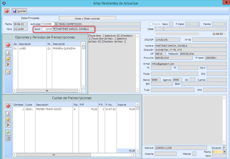 En este caso en la preinscripción con los datos del cliente se tendrán igualmente que comprobar que los datos