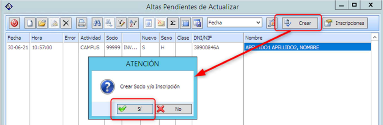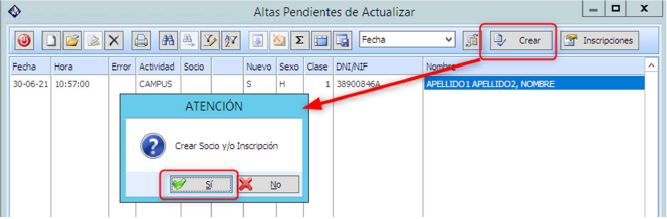 Y contestar afirmativamente a la pregunta “Crear Socio y/o Inscripción”.