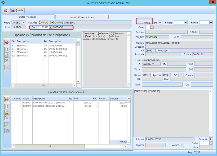 En el caso de las Preinscripciones de No socios, pueden darse dos casos, uno en el que en el momento de la validación