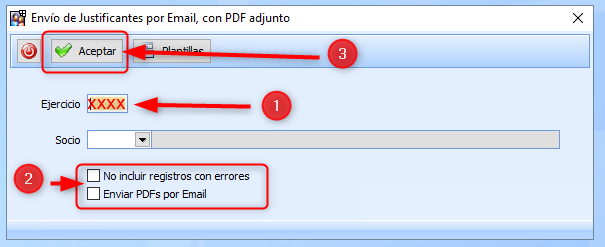 Ir a Facturación – Modelo 182 – Envío Justificante por email, con PDF adjunto (Punto 1 – el año es el año actual) y (Punto 2) debemos DESMARCAR las 2 opciones indicadas, le damos a ACEPTAR, (Punto 3):