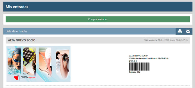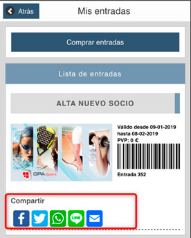 Cuando un socio tenga invitaciones asignadas bien porque el programa las ha generado de manera automática en el caso de las nuevas altas y/o los cumpleaños (véase guía Gestión, Asignación y Consumo de Invitaciones), las podrá ver des de la opción de “Mis entradas”. Tanto en la APP como en “Mi Club Online”