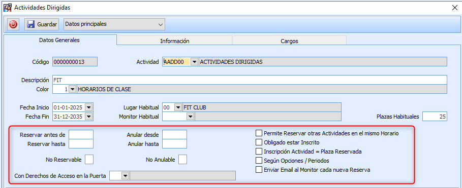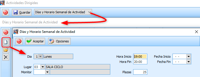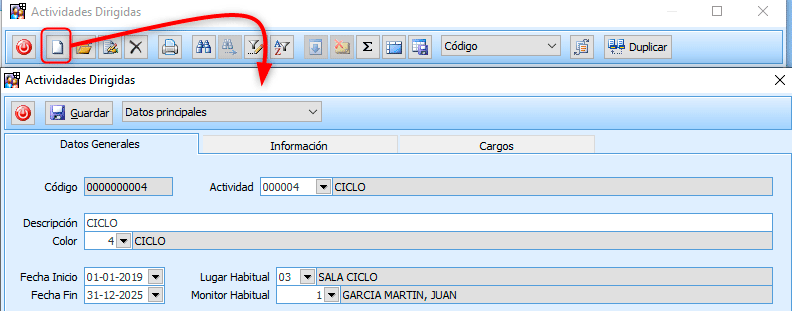 Gestión de actividades dirigidas (Alta actividades dirigidas)