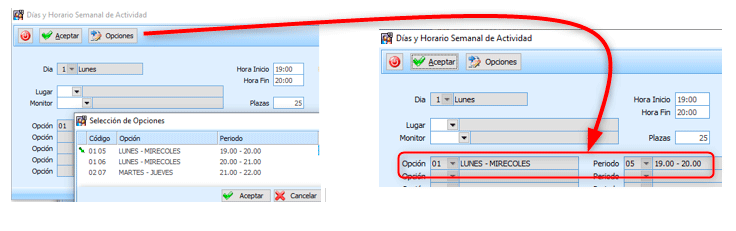 En el caso de que sea necesario indicar a que opción/periodo corresponde cada día/hora para la reserva de plaza automática, deberéis utilizar el botón que muestra la imagen para que el programa os muestre las opciones definidas en la actividad para que podáis seleccionarlas utilizando la barra del espacio o haciendo doble clic sobre ellas
