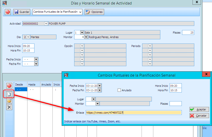 Gestión de Socios > Actividades > Gestión Actividades Dirigidas >Días y Horario Semanal de Actividad