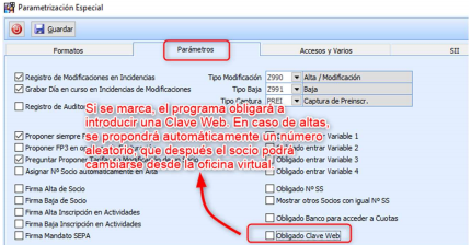 Otra opción, para que al Club no se le olvide generarle la clave en el momento del Alta, es hacer que sea OBLIGATORIO que se rellene ese campo en el momento del Alta como Socio: Gestión de Socios > Procesos > Parametrización Especial