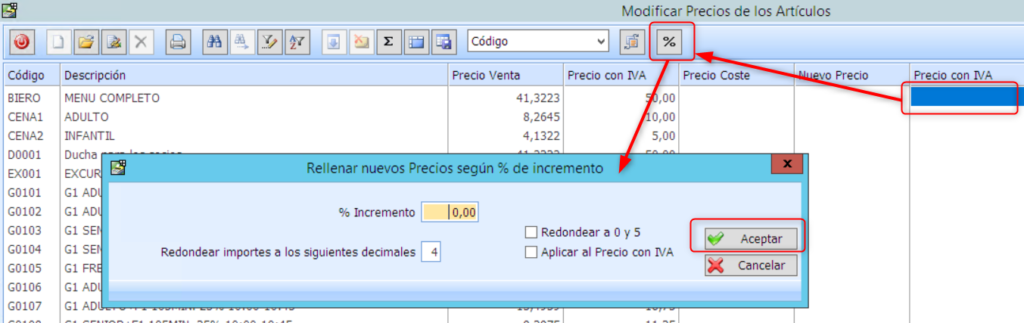 En el caso de que el incremento sea un % masivo, deberéis utilizar el botón que muestra la imagen.