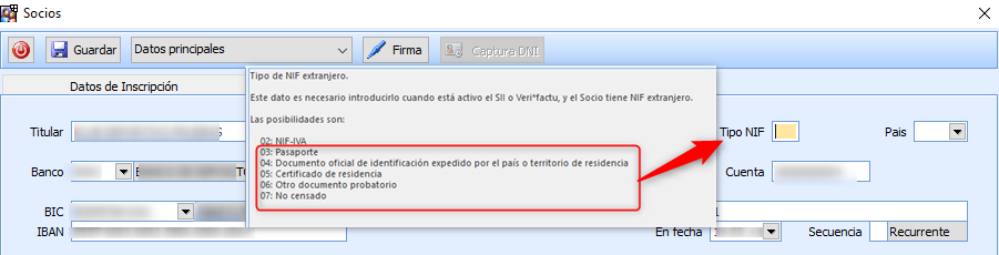 Socio extranjero, en la segunda pestaña de la ficha «Datos Adicionales» se debe indicar el PAIS y el tipo de NIF, según documento identificativo que facilite.